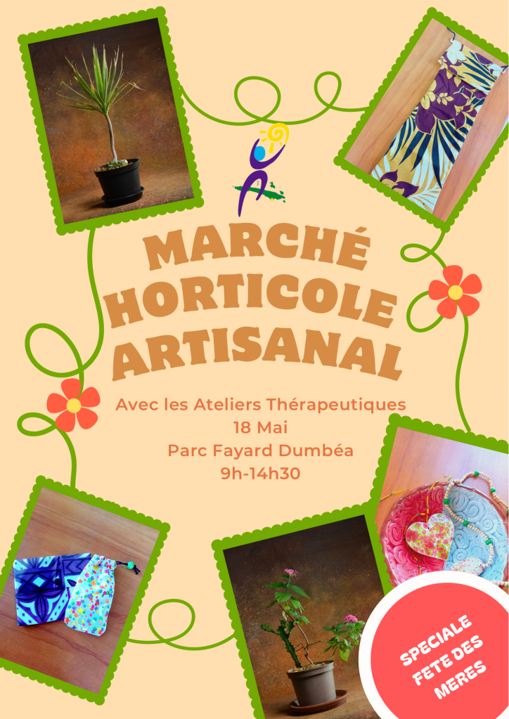 Quand j’étais aux Ateliers Thérapeutique du CHS j’ai réalisé cette affiche sur Canva afin de promouvoir notre stand au marché du Parc Fayard.